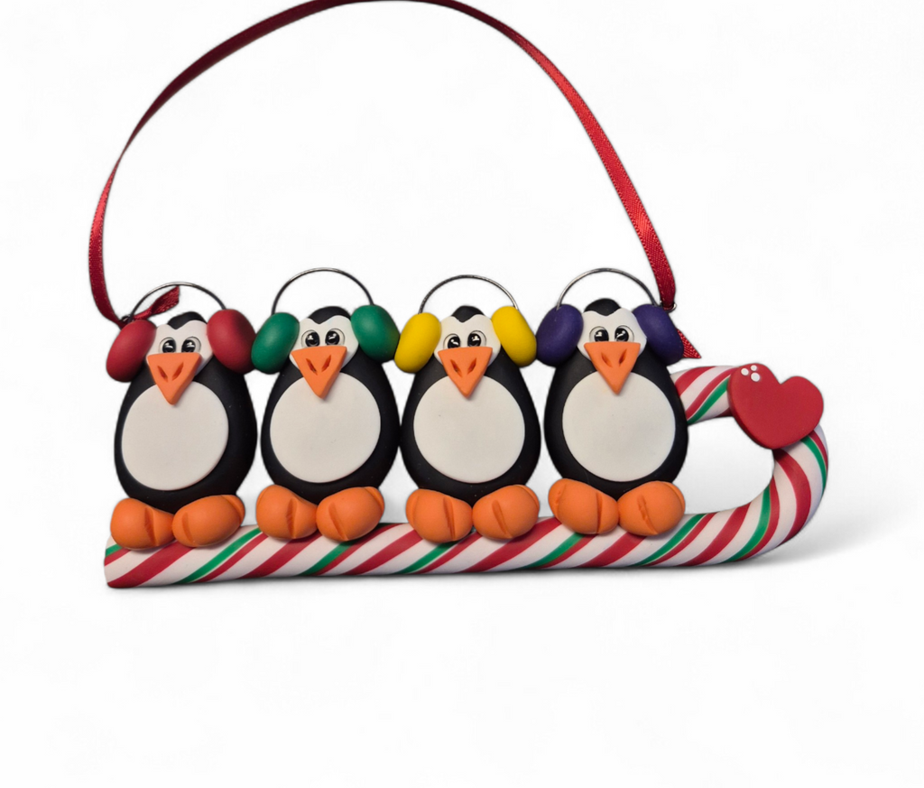 Note: Colors of the penguin ear muffs will vary on each ornament. If there is a specific color you DON'T want for one of the names then please let me know and I will do my best to accomodate but I cannot guarantee it. Color combinations will be different every ornament (red, green, blue, yellow, pink, purple, orange)